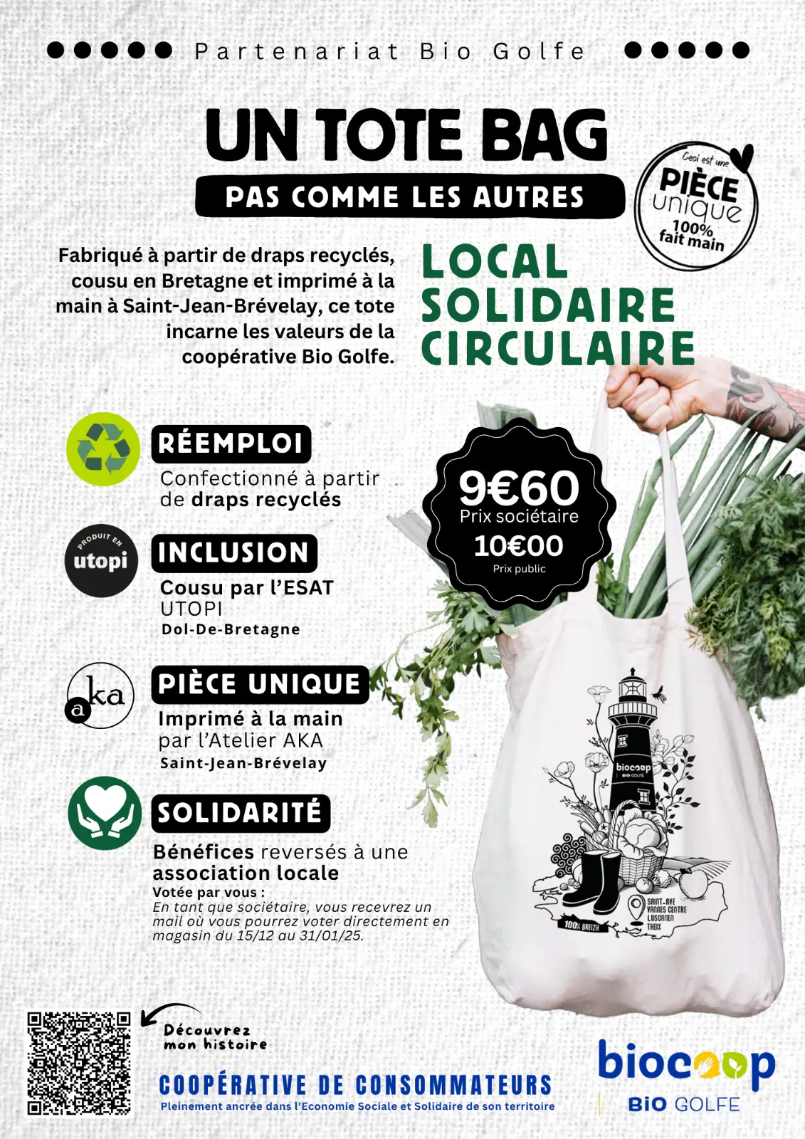 Fidèle à ses valeurs d’ancrage territorial et d’économie solidaire, Bio Golfe Biocoop lance son tout premier tote bag 100 % Breizh : un sac unique, éthique et plein de sens. Conçu à partir de draps recyclés, cousu en Bretagne et imprimé à la main à Saint-Jean-Brévelay, il incarne parfaitement la démarche responsable et coopérative du réseau.